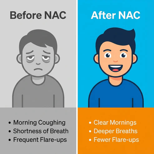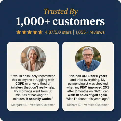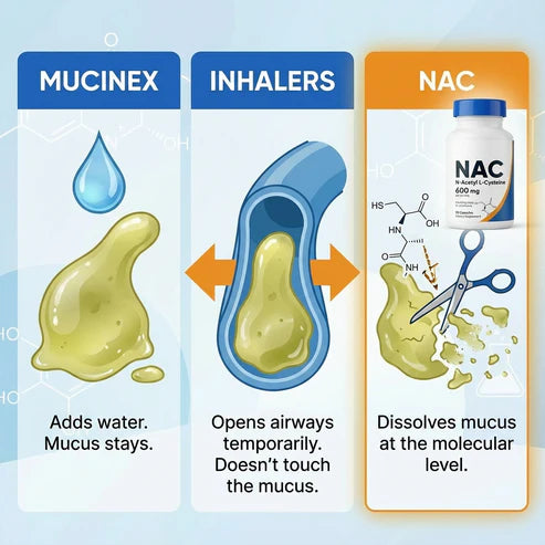 NAC works differently. It chemically breaks the bonds holding mucus together, dissolving it at the molecular level. Plus, it restores glutathione — your lungs' natural defense system.